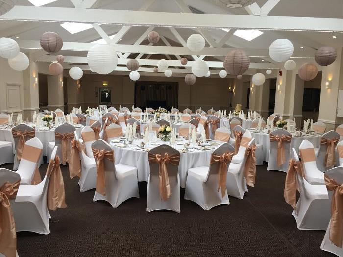 • Chair covers with sash, table linen, table runners, napkins, petals and crystal gems, table centre pieces , hand written place cards, and printed table plan all of your chosen colour scheme. (Subject to availability of colour)